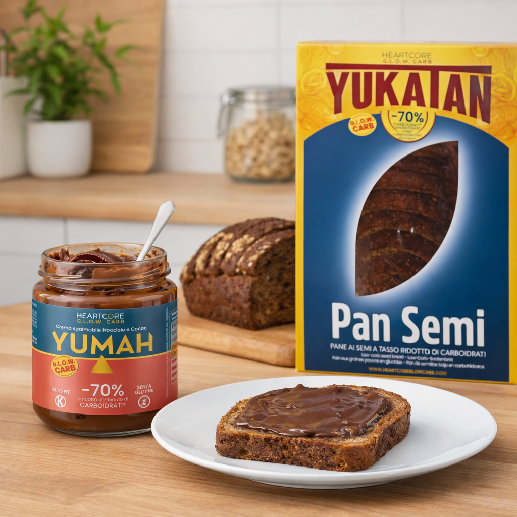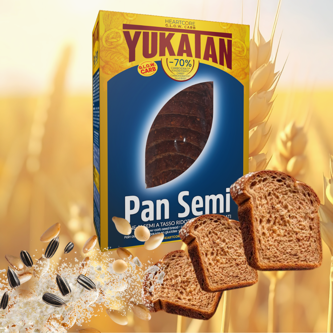 YUKATAN PAN SEMI è il pane che mancava. Con il 70% di carboidrati in meno rispetto al pane tradizionale, contiene solo: 5g di carboidrati per 100g e 1,2g di zuccheri per 100g. Perfetto da: tostare, farcire dolce o salato, usare come base per colazioni proteiche, accompagnare i pasti senza picchi glicemici.